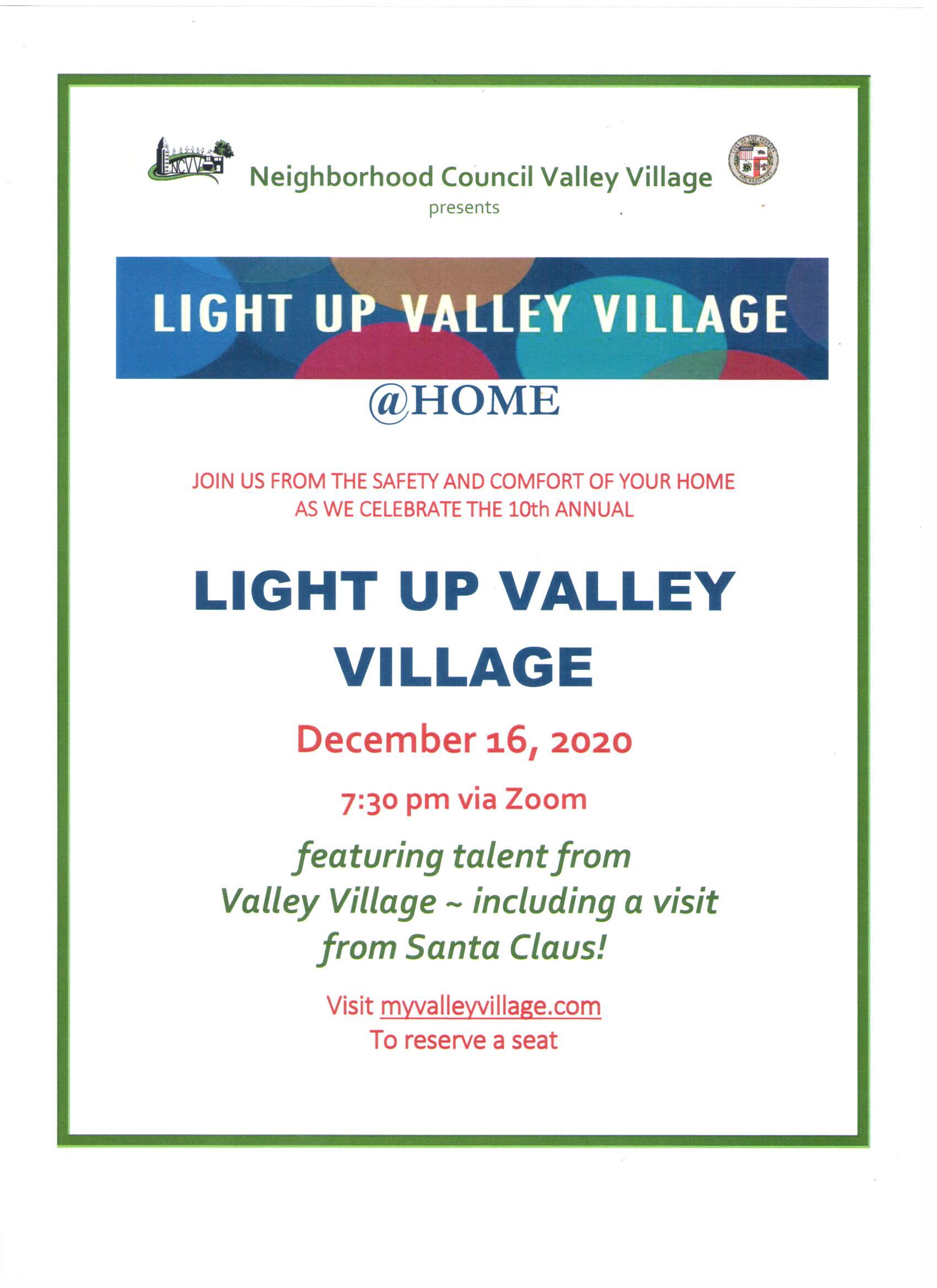Join us for Light Up Valley Village @Home on Zoom December 16, 7:30pm.