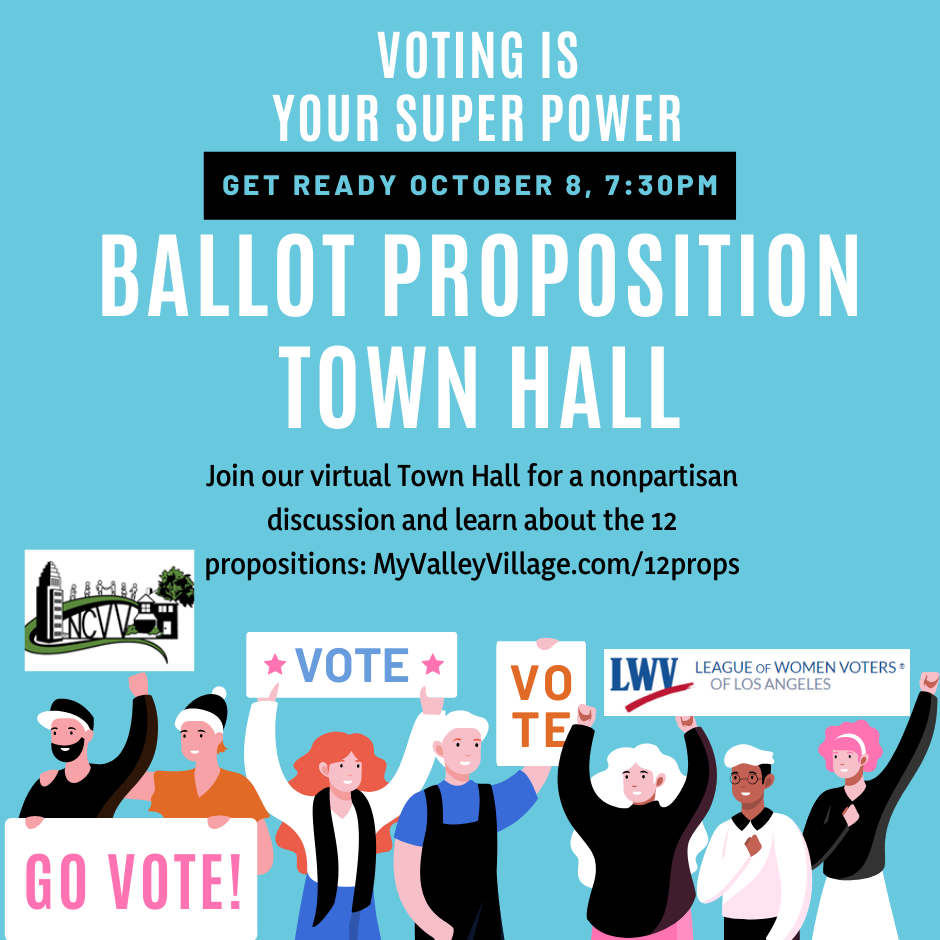 NCVV’s Board of Directors has partnered with the League of Women Voters to help you understand the 12 propositions. Join us for a virtual Town Hall and take part in a nonpartisan discussion of these measures from the League of Women Voters.