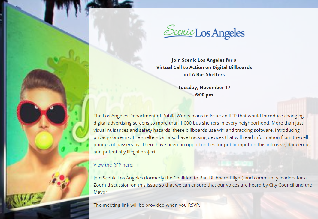 Join Scenic Los Angeles for a Virtual Call to Action on Digital Billboards in LA Bus Shelters Tuesday, November 17, 6:00 pm