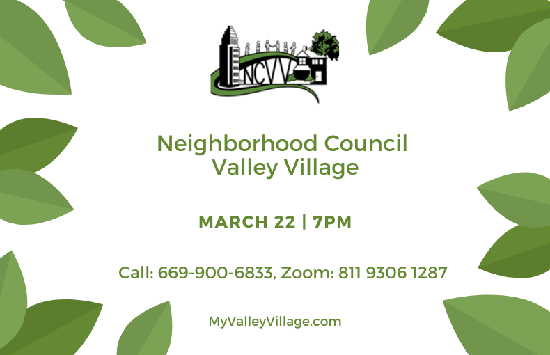 Join us for the next Neighborhood Council Valley Village Board of Directors Meeting on Wednesday, March 22, 7pm.