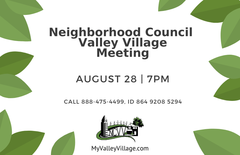 Join us for the next meeting of the Neighborhood Council Valley Village August 28, 7pm online.