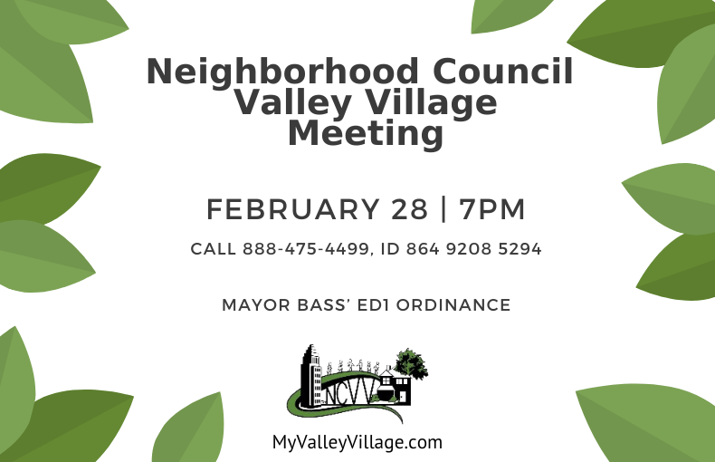 Join us for the next Neighborhood Council Valley Village meeting February 28, 7pm.