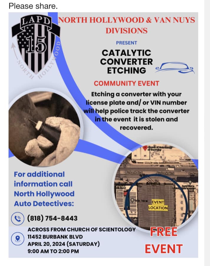 North Hollywood and Van Nuys LAPD Divisions present this free catalytic converter etching event across from the Church of Scientology, 11452 Burbank Blvd.