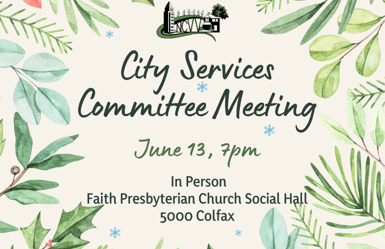 Join us for the NCVV City Services Committee Meeting June 13, 7pm at Faith Presbyterian Church, 5000 Colfax Ave.