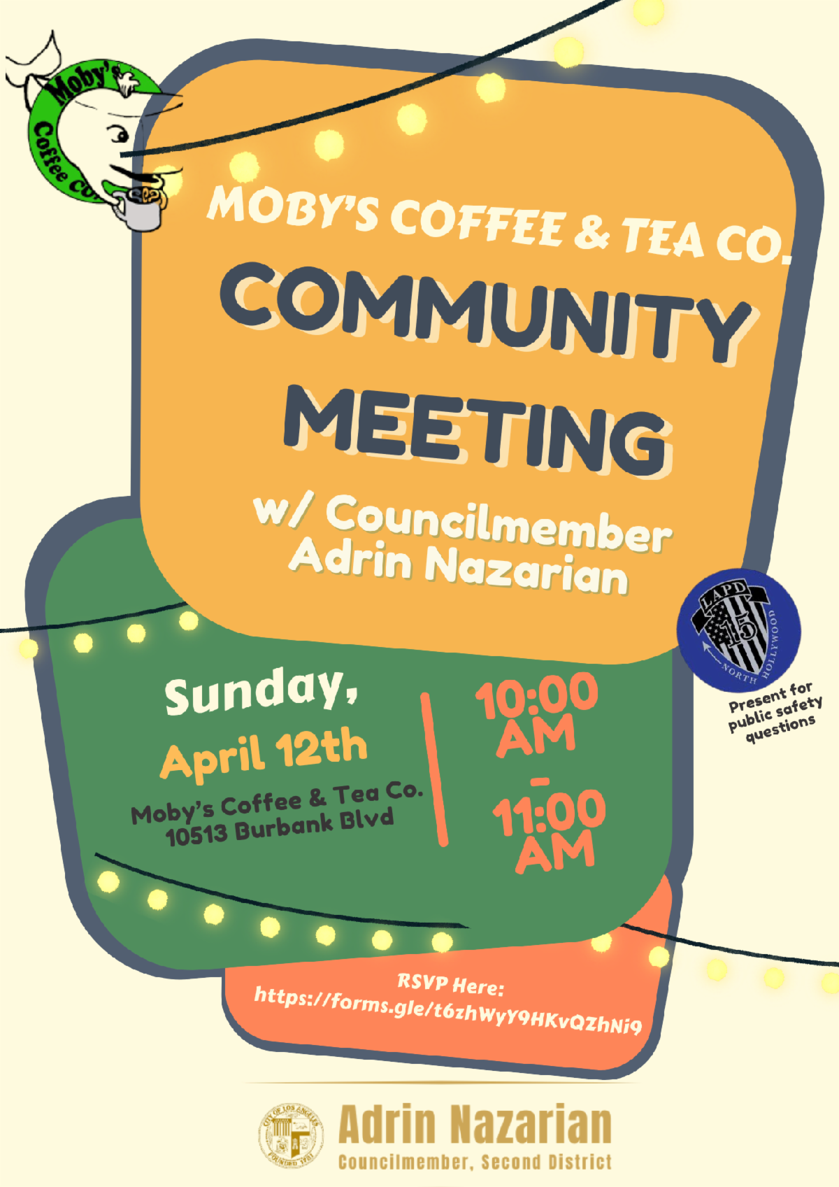 Councilmember Nazarian meets informally with constituents at locations throughout District 2. This month, the Councilmember and an LAPD representative will be on hand to discuss your questions and concerns at Moby’s Coffee & Tea Company in North Hollywood.