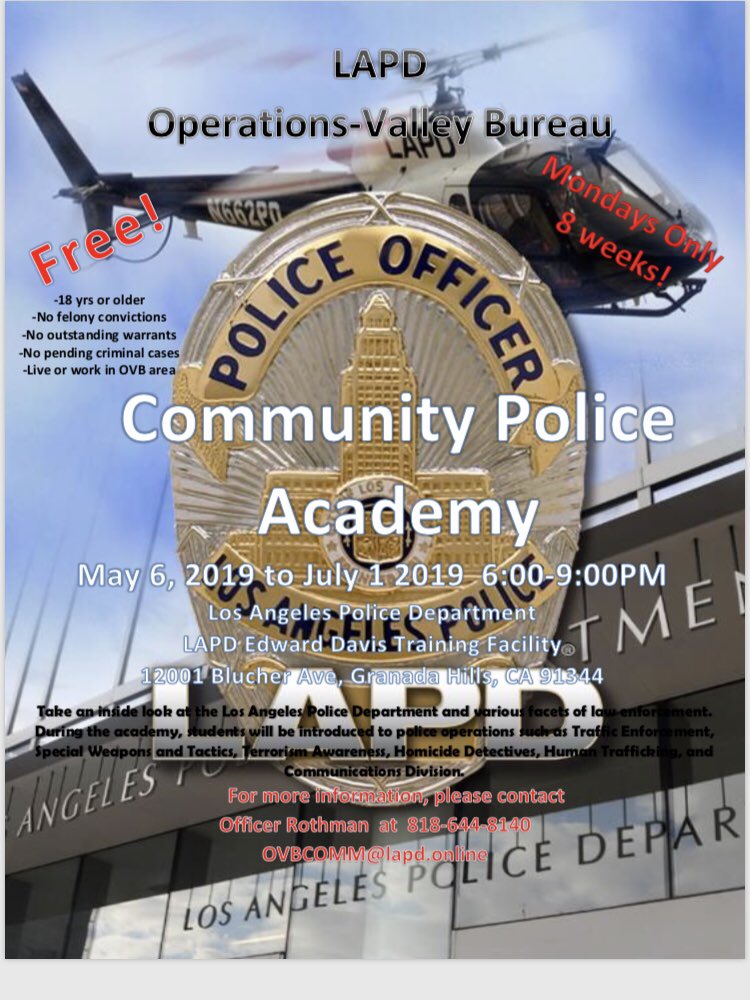 LAPD Chief Moore is looking to use more volunteers to enable more officers to be in the field. Now is your chance to get trained and get involved! This training is free on Monday evenings for 8 weeks. Please contact Officer Rothman at 818-644-8140.