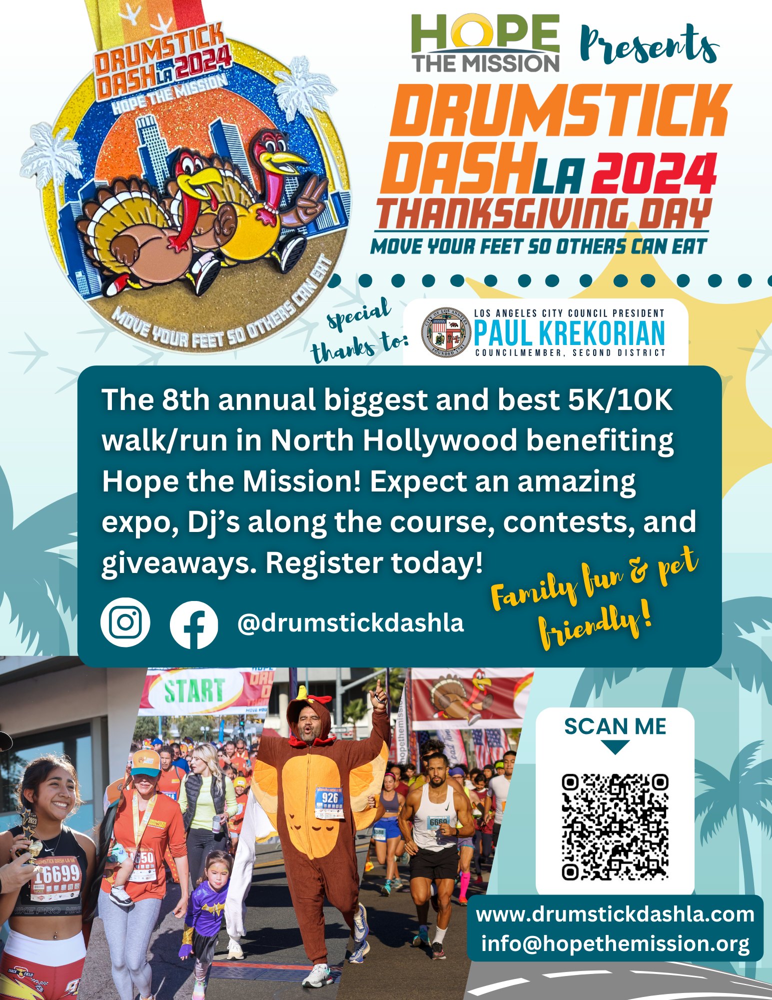 Hope the Mission presents the 8th annual Drumstick Dash LA on Thanksgiving Day. The run is the largest of its kind in Los Angeles benefitting a great cause. Friendly to all levels of Dashers, feel free to run, jog, or walk to complete the 5K or 10K course. Expect lots of freebies, an expo, dance and costume contests, DJs pumping the tunes along the course, and enthusiastic crowds cheering you on!