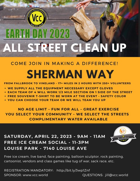 We will be cleaning the streets, curbs and bushes along Sherman Way from Platt to Vineland – to celebrate Earth Day.