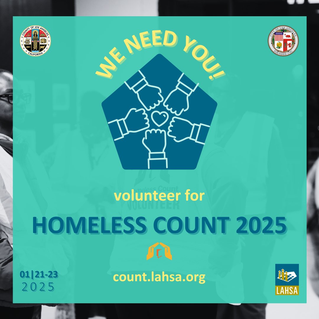 Join and make a difference! You can now register to volunteer for the 2025 Greater Los Angeles Homeless Count! This essential event aims to count our unhoused neighbors and obtain data that helps us develop effective strategies to address the homelessness crisis in Los Angeles City and County. Mark your calendars for Homeless Count 2025, taking place on the nights of January 21, 22, and 23. To learn more and sign up, visit count.lahsa.org!