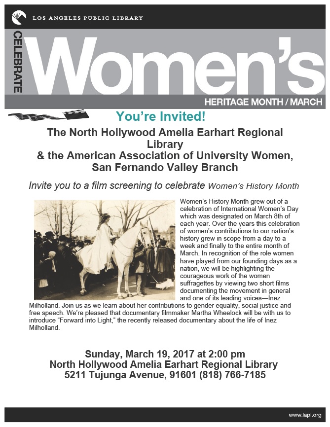 The North Hollywood Amelia Earhart Regional Library and the American Association of University Women, San Fernando Valley Branch, invite you to a film screening to celebrate Women’s History Month. Learn about the contributions of Inez Milholland to gender equality, social justice and free speech. Documentary filmmaker Martha Wheelock will join the event to introduce “Forward into Light,” the recently released documentary about the life of Inez Milholland.