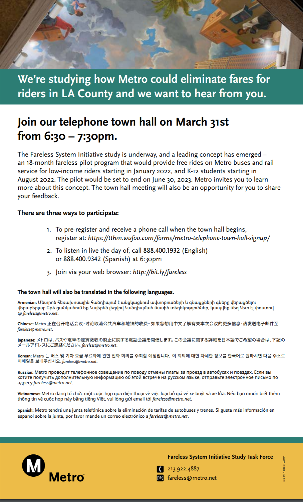 The Fareless System Initiative study is underway, and a leading concept has emerged – an 18-month fareless pilot program that could provide free rides on Metro buses and rail service for low-income riders starting in January 2022, and expanding to all K-12 students in August 2022. The purpose of the pilot is to test the feasibility of a fully fareless system. At the conclusion of the pilot in June 2023, Metro will evaluate the possibility of a fully fareless system. Metro invites you to learn more about this concept. The Town Hall meeting will also be an opportunity for you to share your feedback.