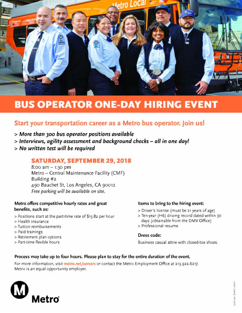 Metro invites you to a one-day bus operator hiring day. More than 300 bus operator positions are available. There is no written test, and interviews, agility assessment and background checks will be conducted all in one day. For more information, visit metro.net/careers or contact the Metro Employment Office at (213) 922-6217.