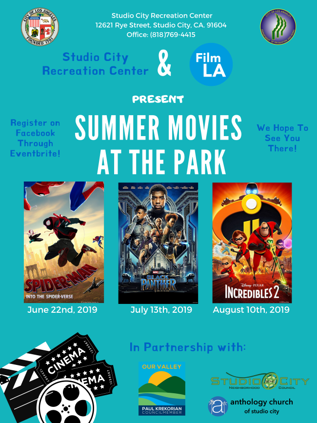 The Department of Recreation and Parks, in partnership with FilmLA and the Office Councilmember Krekorian is hosting summer movies at the Studio City Recreation Center.