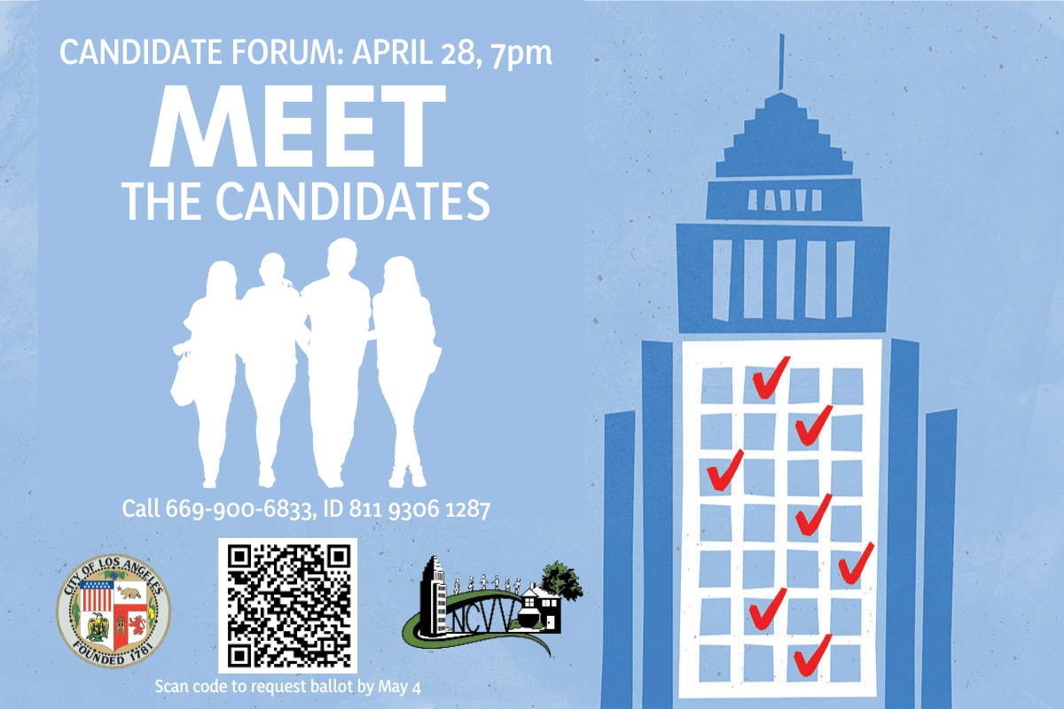 Join us this Wednesday, April 28, and meet your candidates for NCVV’s 2021 Board election. Seventeen of your neighbors have qualified for our election this year in the categories of homeowner, renter, education and business. At 7:00 pm this Wednesday you will have a chance to hear from all of them as they share their vision for Valley Village. We hope you will join us for the 2021 NCVV Candidate Forum which will be hosted on Zoom at the following link: