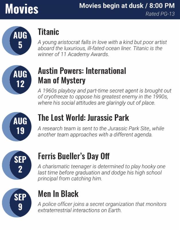Movies begin at dusk, approximately 8PM.
