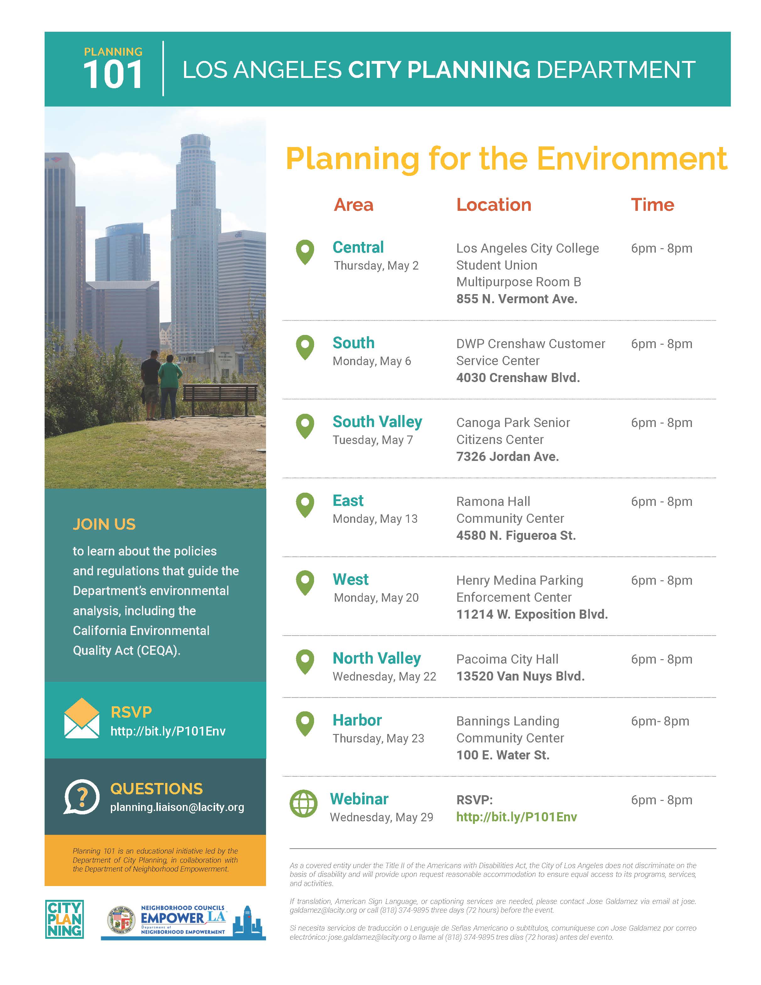 The topic of the training will be Planning for the Environment. Participants will learn about the role the City and its residents have in planning for the environment and the regulations that guide environmental analysis, including the California Environmental Quality Act (CEQA).