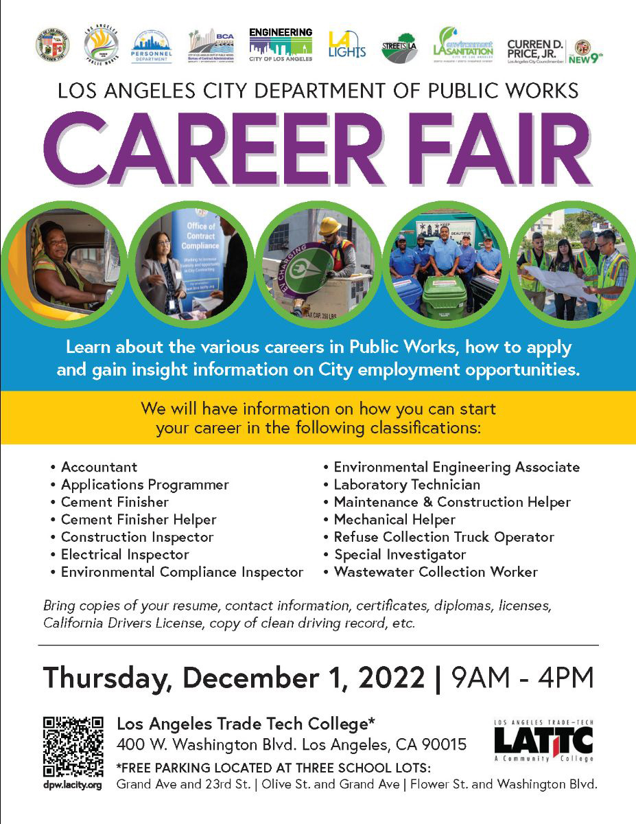 The Department of Public Works is partnering with the Personnel Department to hold our first department-wide Career Fair to help us fill positions throughout the city. Those who attend will learn about the various careers in Public Works, how to apply and gain insight information on City employment opportunities.