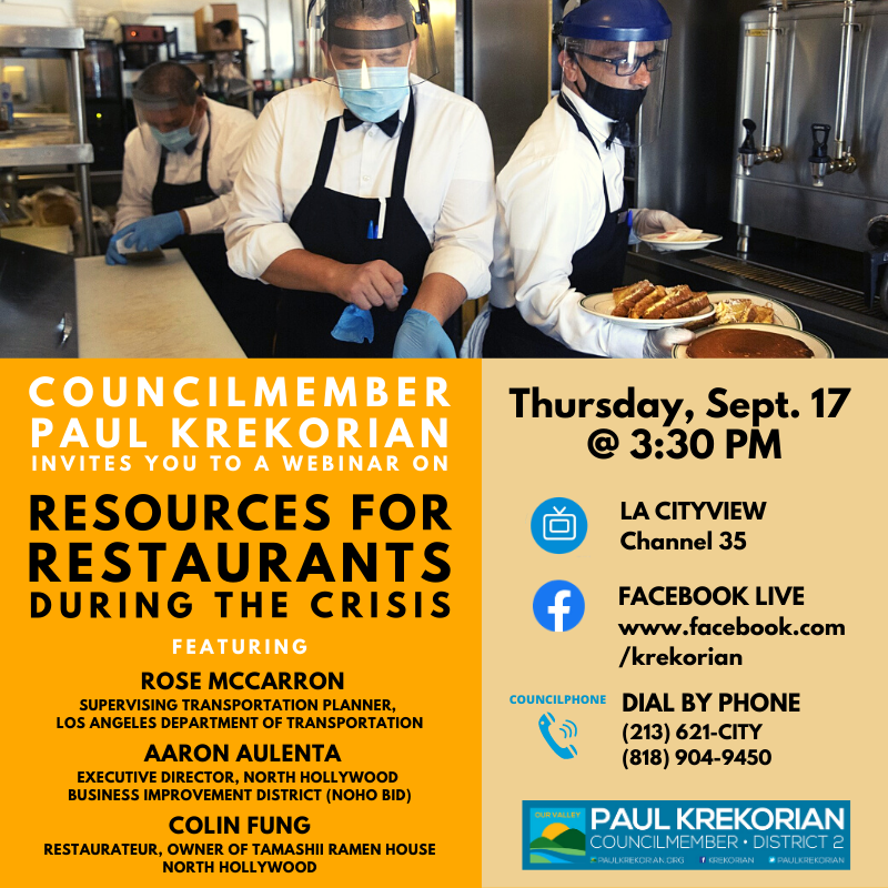 Join this Thursday’s (9/17) webinar on “Resources for Restaurants During the Crisis” at 3:30 pm, for vital information on Al Fresco dining, economic assistance to restaurants, and the future of the local industry.