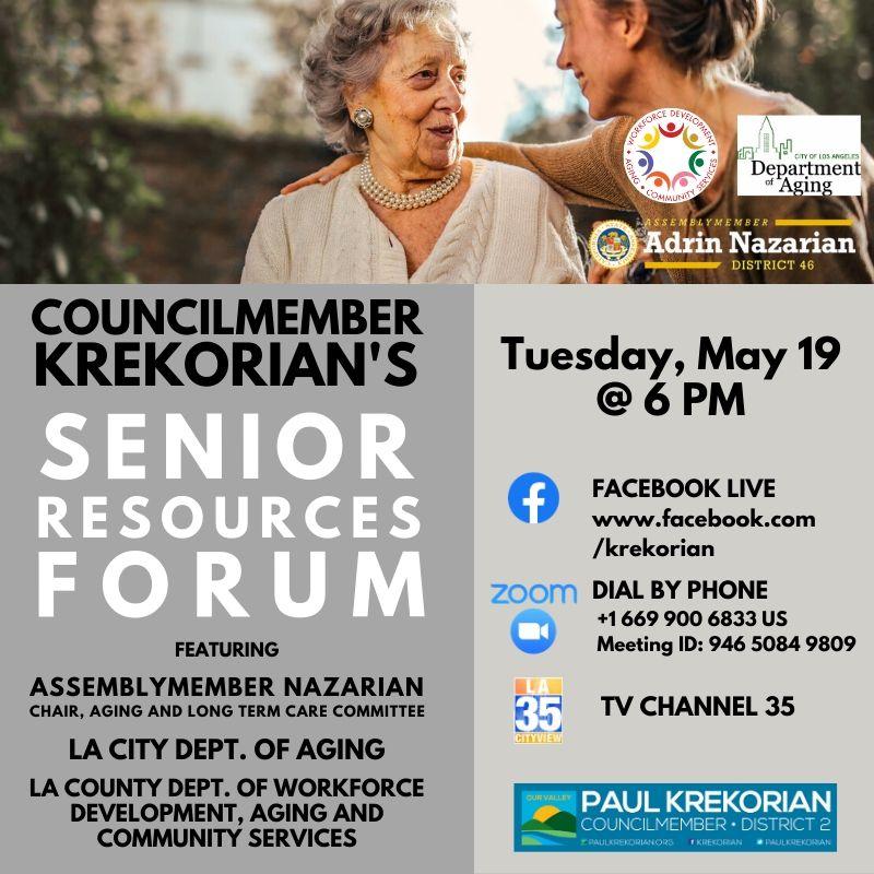 Please join Councilmember Krekorian for a virtual Senior Resources Forum Tuesday, May 19, from 6 p.m. to 7 p.m. Participants will learn about the programs, resources, and assistance available to seniors during the COVID-19 pandemic.