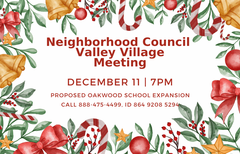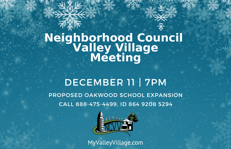 Join us online for a Special Meeting of the Neighborhood Council Valley Village Wednesday, December 11, 7pm.