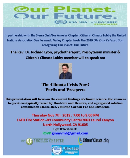 Celebrate UN Day 2019 with the United Nations Association San Fernando Valley Chapter and the Sierra Club/Los Angeles Chapter, Citizens’ Climate Lobby. Guest speaker, Rev. Dr. Richard Lyon, will discuss The Climate Crisis Now! Perils and Prospects. The presentation will also address the current findings of climate science and a proposed solution in House Res. 763: the Carbon Fee and Dividend. For more information and to RSVP, contact ginnyvmh@gmail.com.