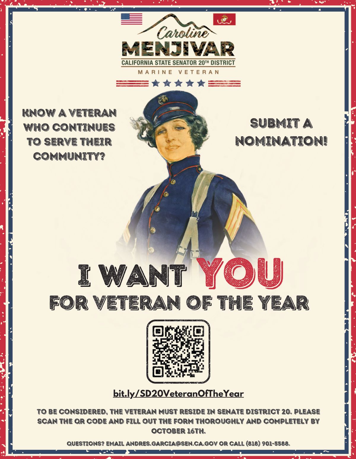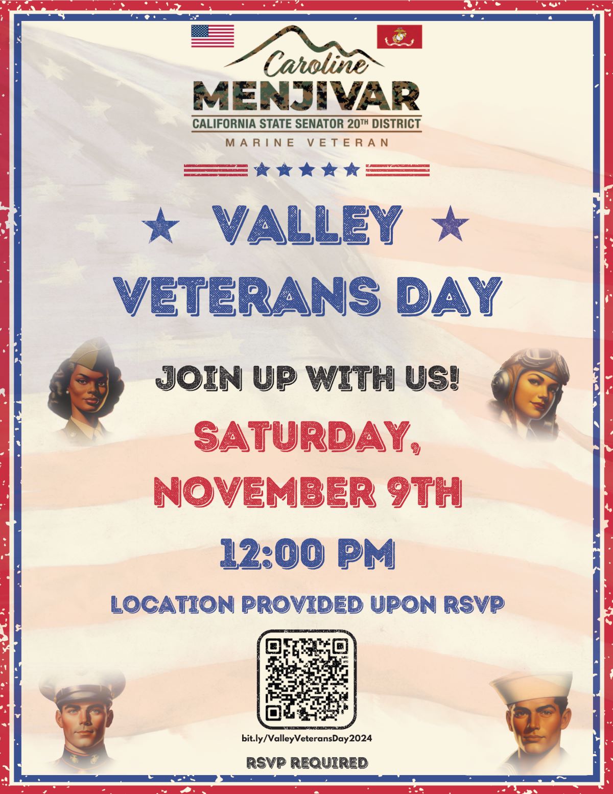 Senator Caroline Menjivar, a Marine Corps Veteran, cordially invites you and all Veterans to her second annual Valley Veterans Day event. Please join Senator Menjivar for a wonderful afternoon celebrating and honoring fellow Veterans of the Valley. Food and refreshments will be provided courtesy of Senator Menjivar & our partners.