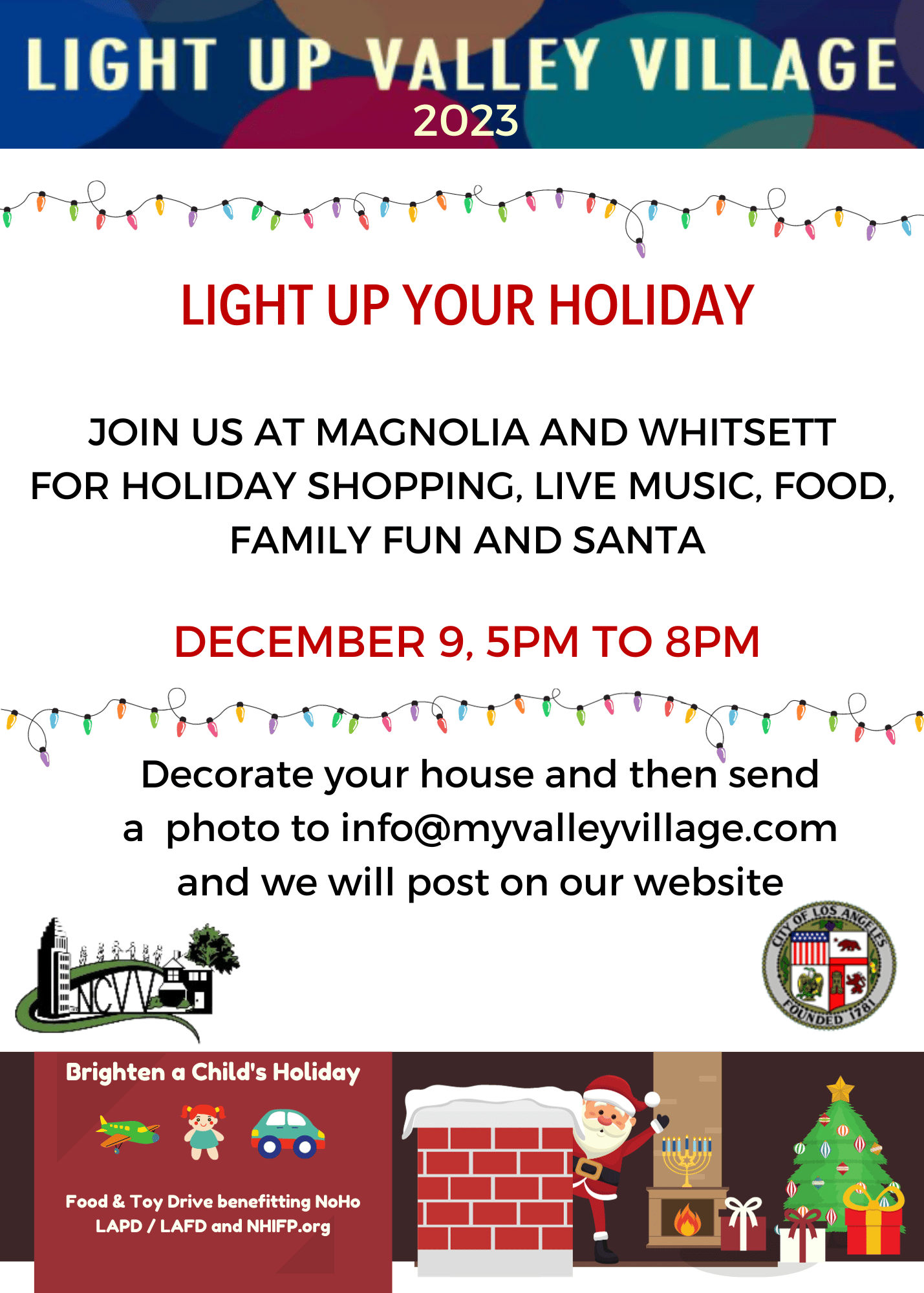Light Up Valley Village Join us for Light Up Valley Village December 9, 5-8pm at Whitsett & Magnolia and bring toys and canned food for our drive. Communications Team2023-12-12T10:18:50-08:00December 8th, 2023|